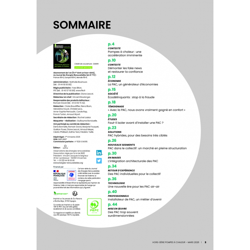 Solutions clés pour se passer définitivement des énergies fossiles dans le bâtiment, les pompes à chaleur sont promises à un bel avenir. Quelles économies ? Quelle isolation ? Quel dimensionnement pour la PAC ? Individuelle ou collective ? Comment éviter les fraudes ? Le point sur toutes ces questions et de nombreux retours d'expérience dans ce numéro.